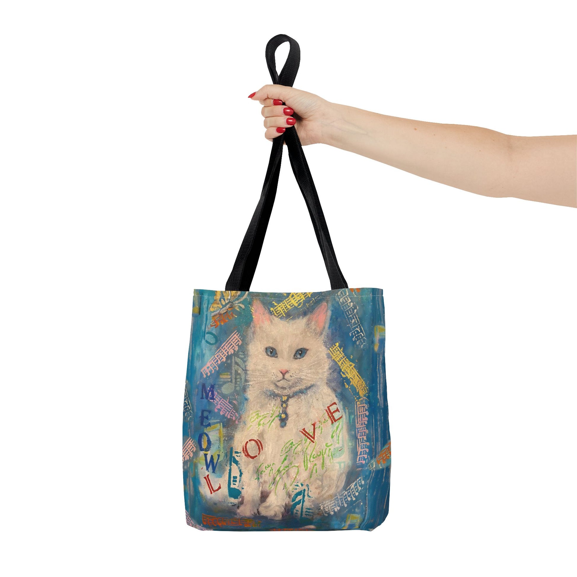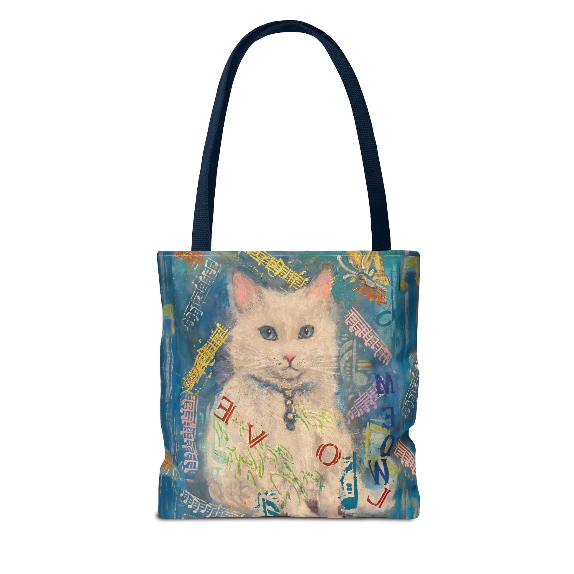 This Tote Bag with 'Good Vibes Only' White Cat design by Fairyhill Studio exudes positivity and charm. Perfect for cat lovers and those who appreciate art, this tote bag can add a touch of whimsy to any outfit. Ideal for everyday use, this durable polyester bag comes in 5 handle color options and 3 sizes to suit your needs. A great gift for birthdays, holidays, or any special occasion.
