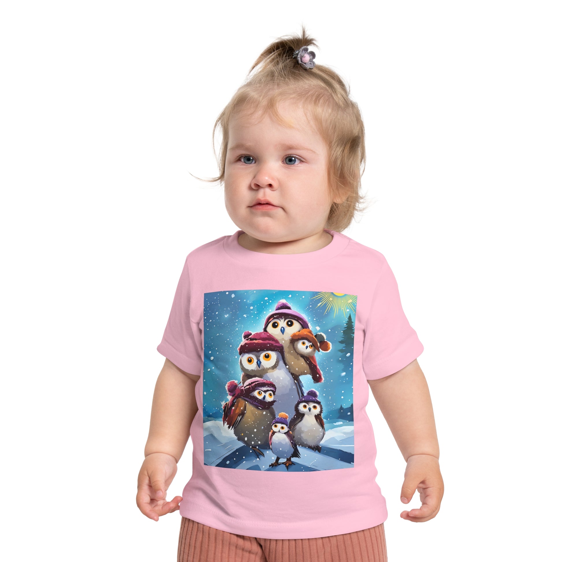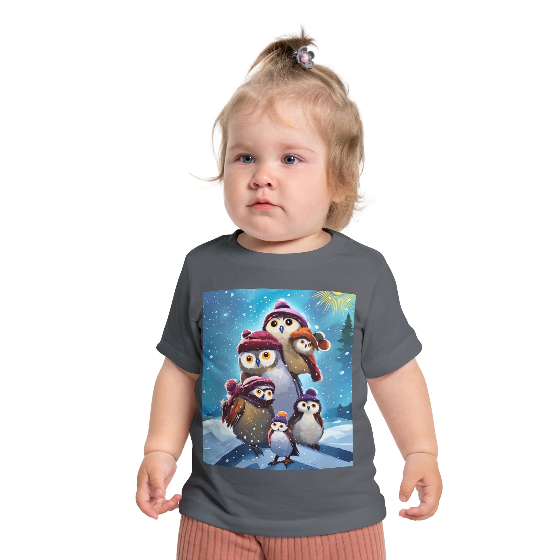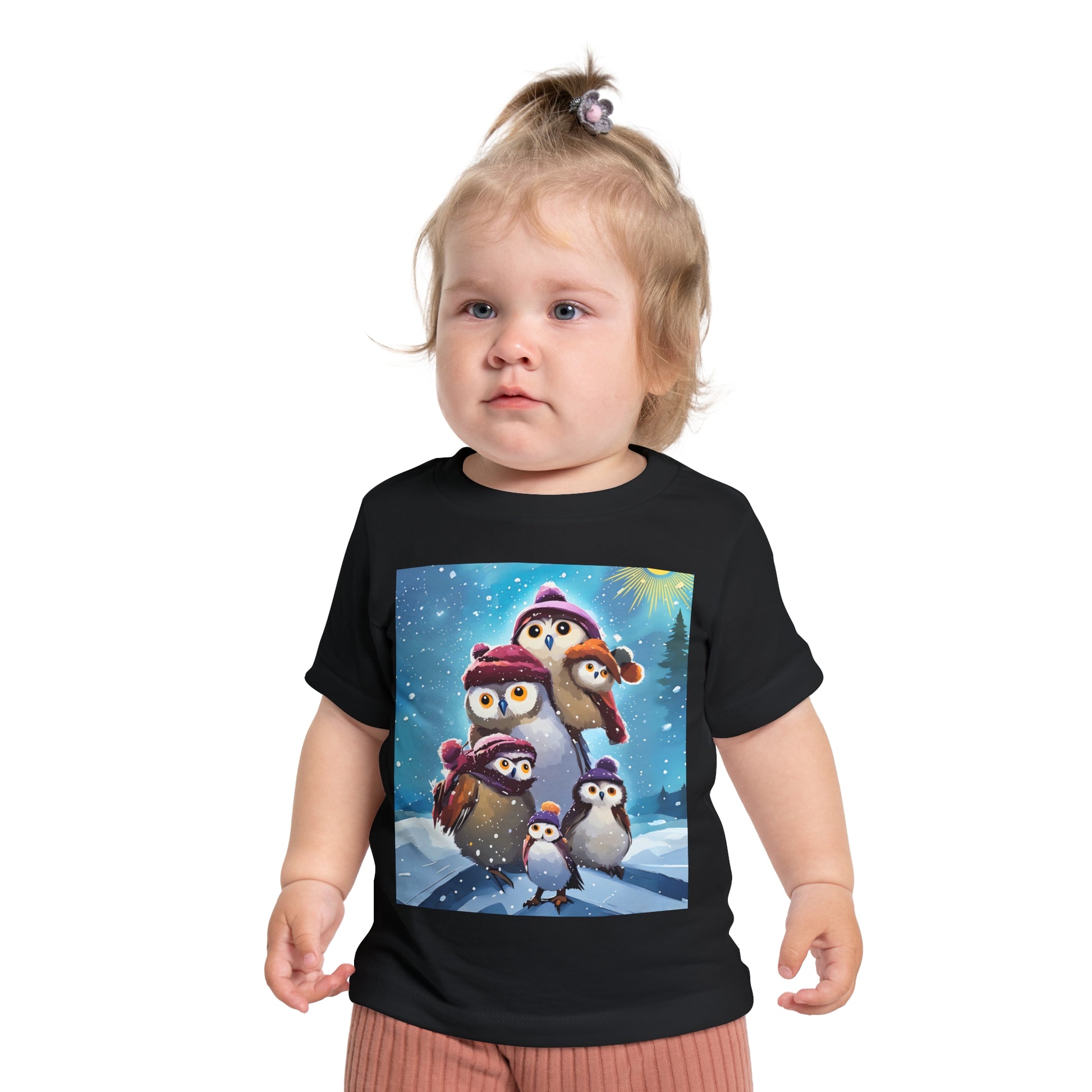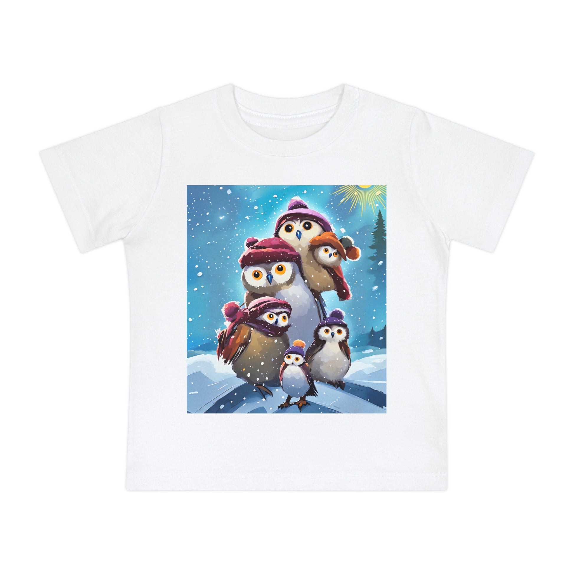 This adorable Winter Owls and penguin family in snow Baby T-Shirt is a cute short sleeve tee for kids, perfect for the chilly season. The whimsical design brings a playful and joyful vibe, making it ideal for little ones to wear during the winter holidays and family gatherings.