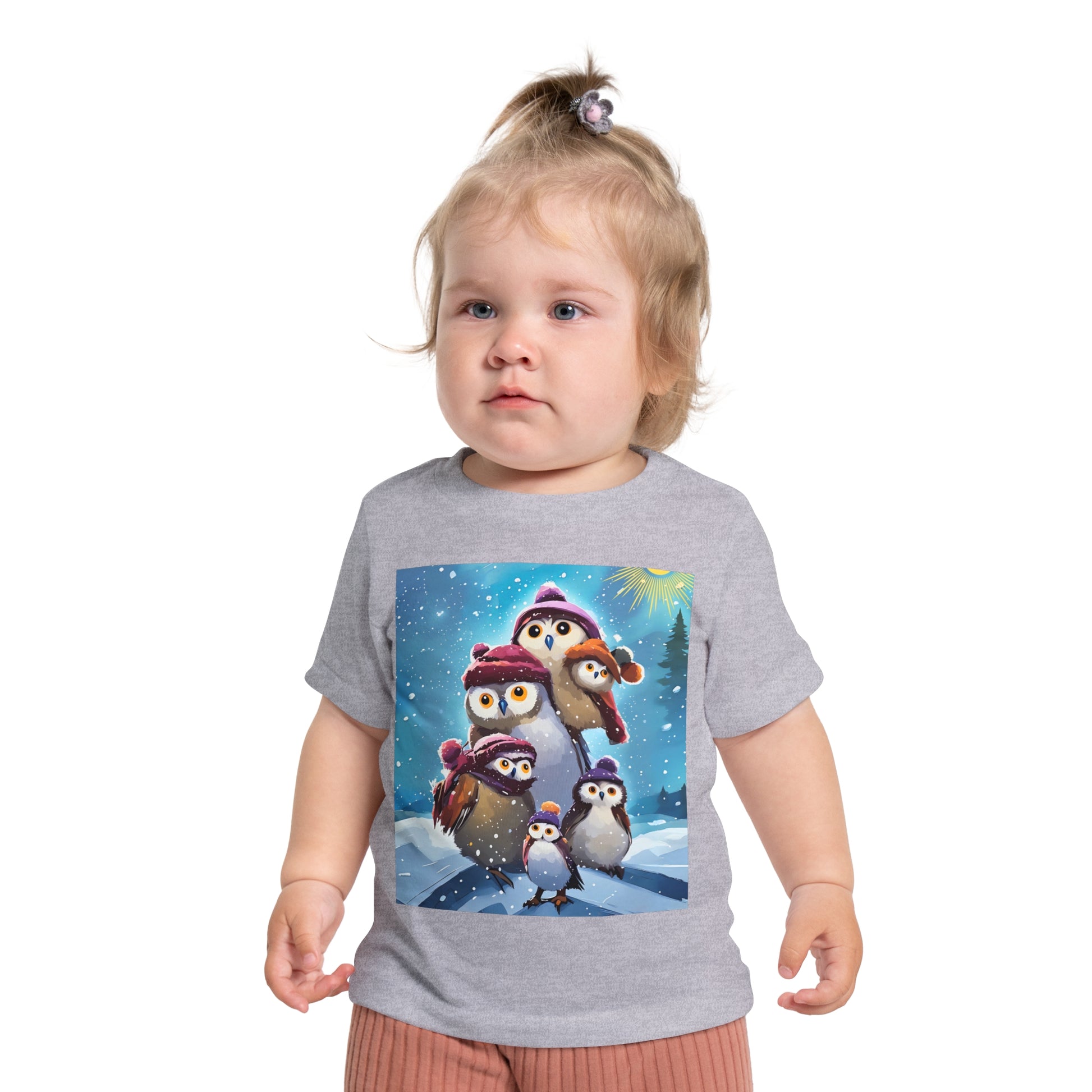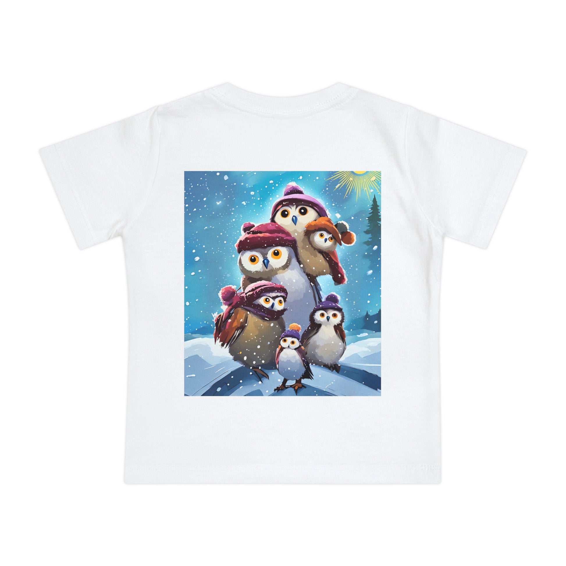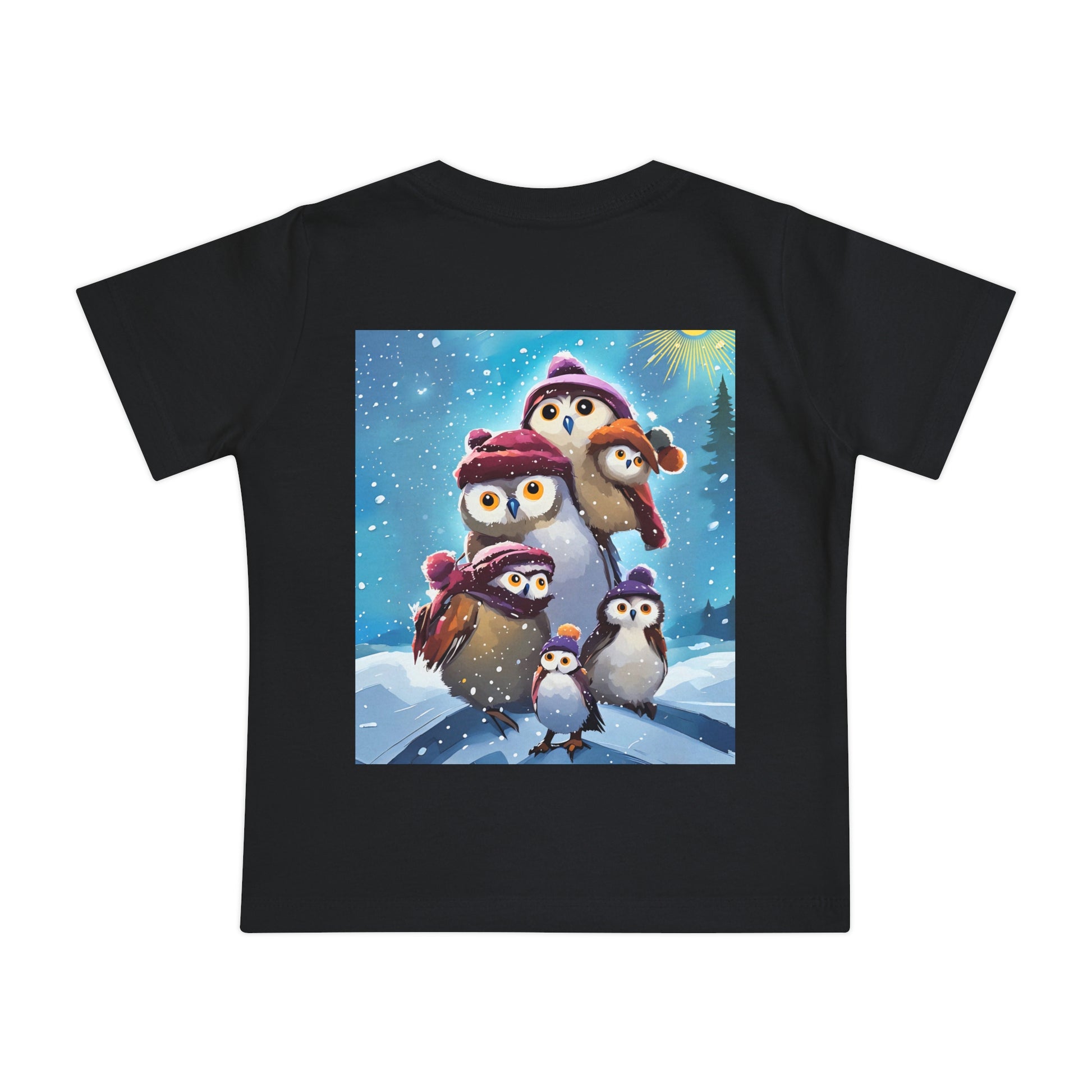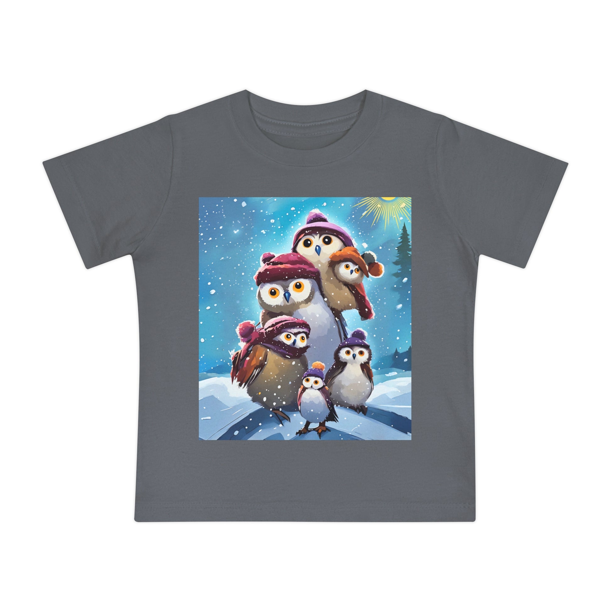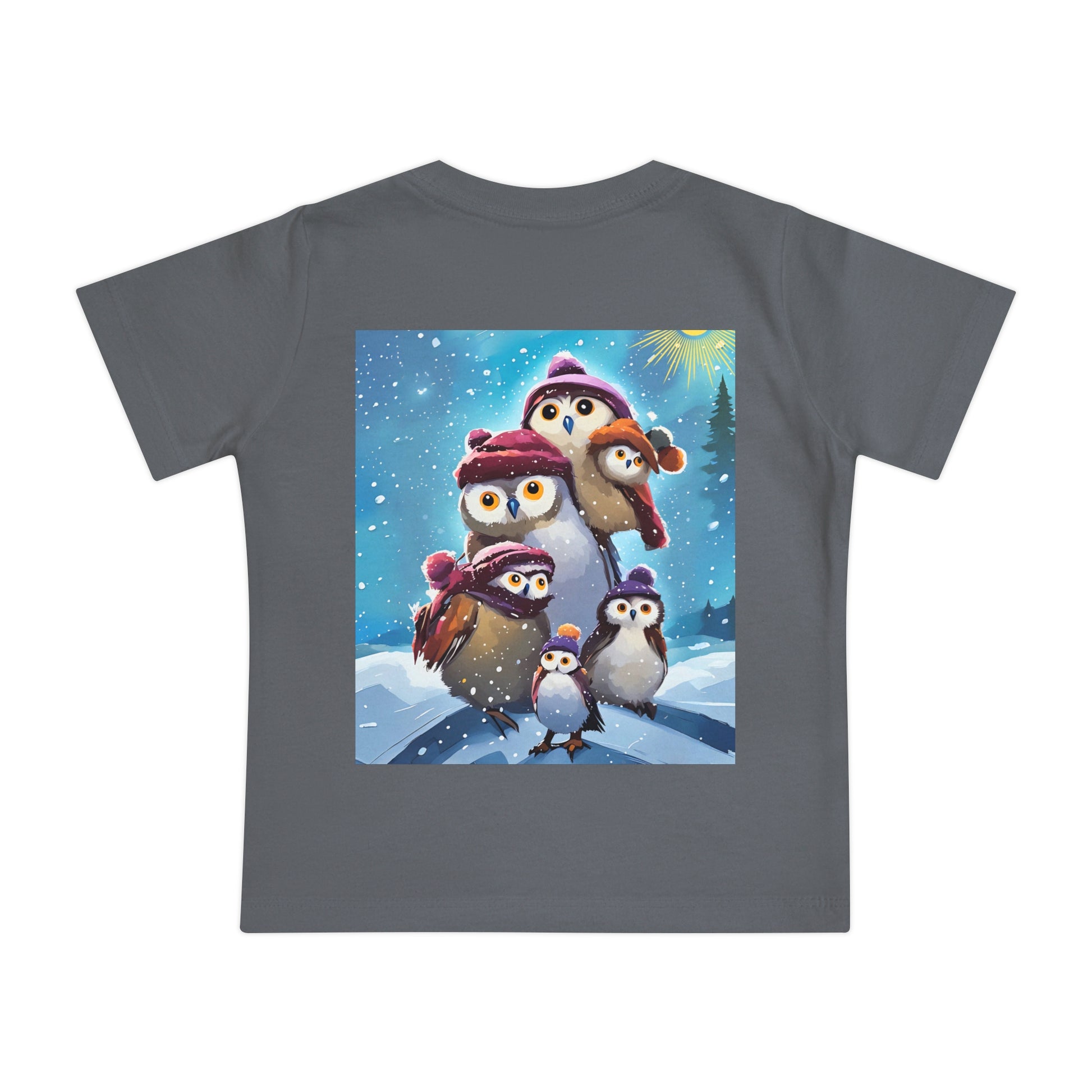 This adorable Winter Owls and penguin family in snow Baby T-Shirt is a cute short sleeve tee for kids, perfect for the chilly season. The whimsical design brings a playful and joyful vibe, making it ideal for little ones to wear during the winter holidays and family gatherings.