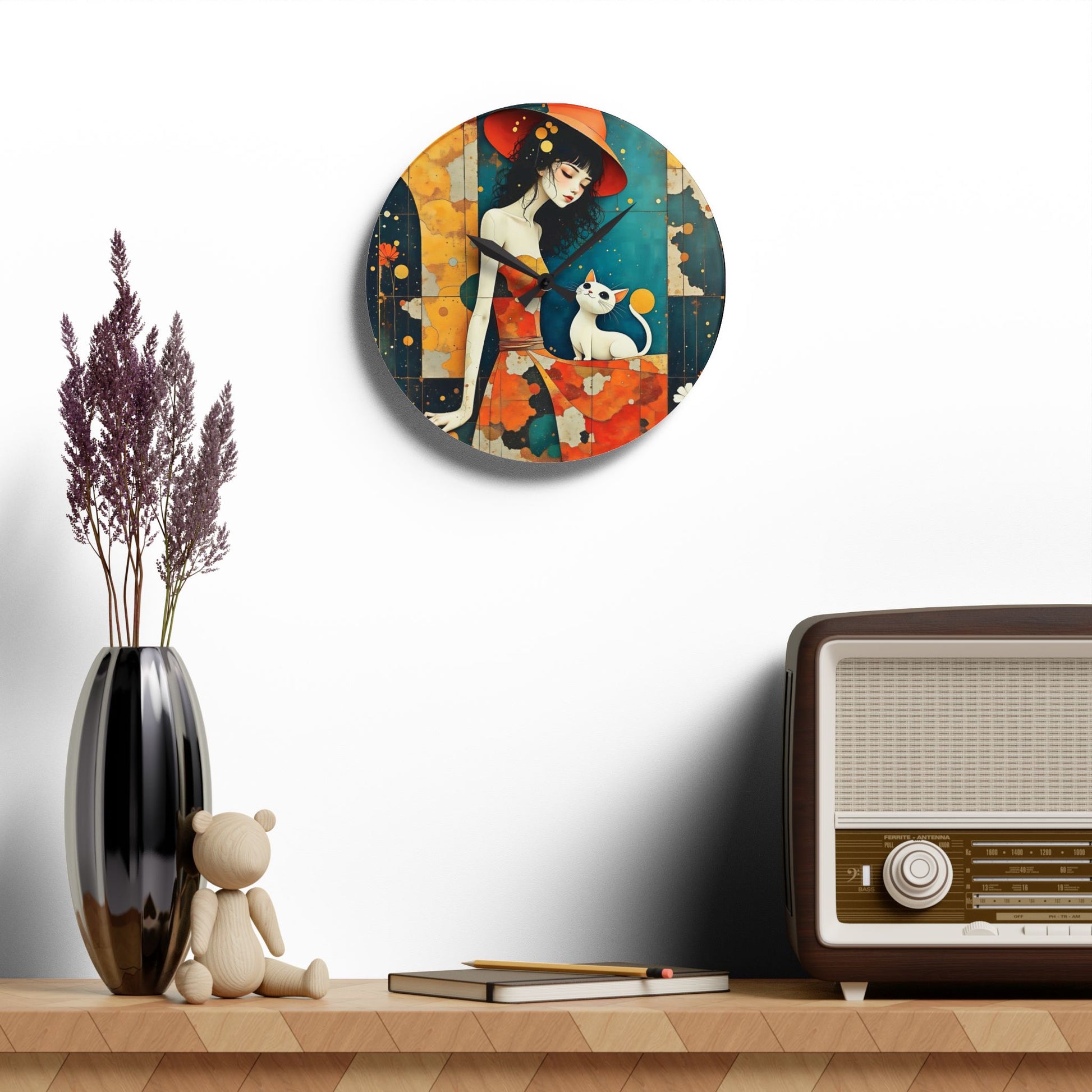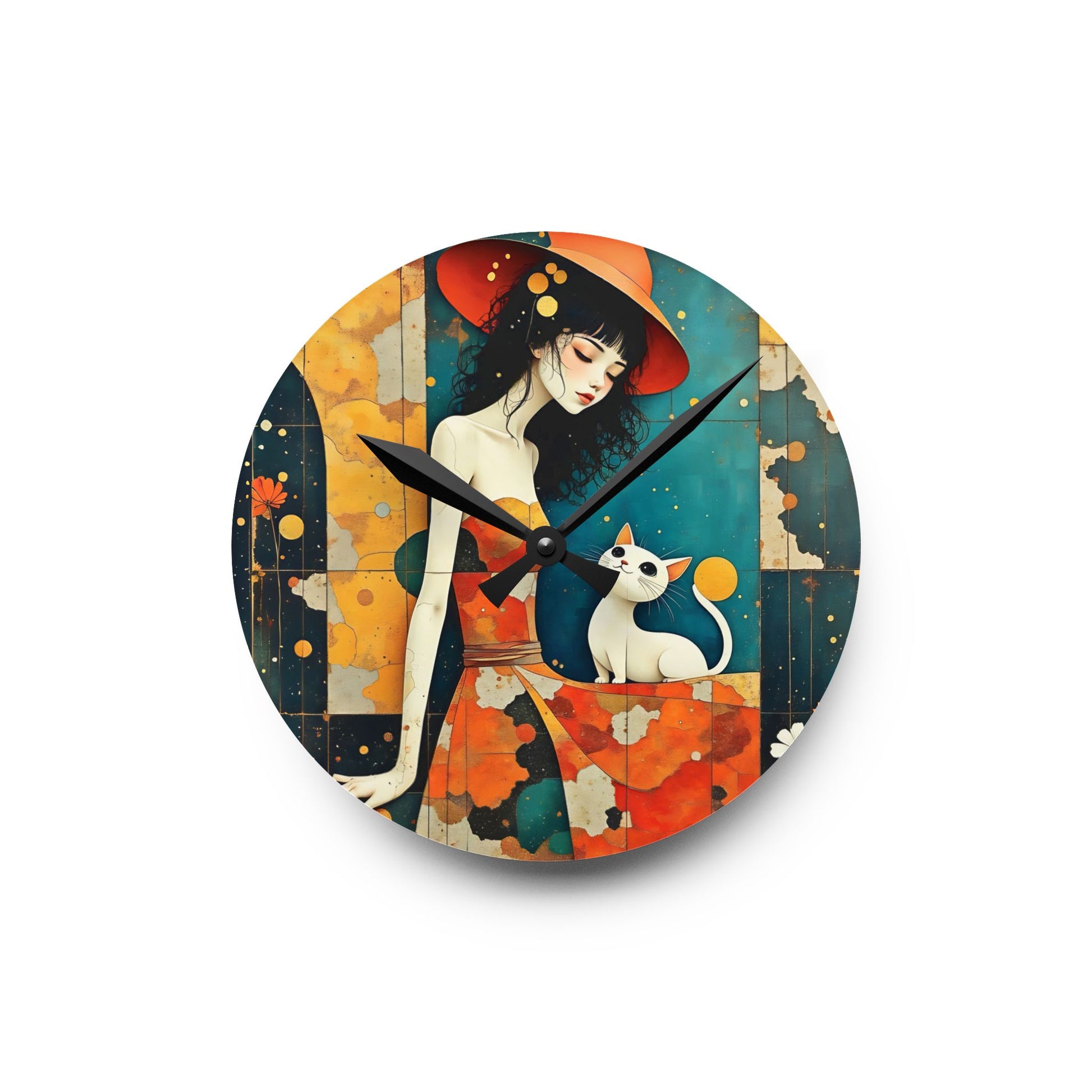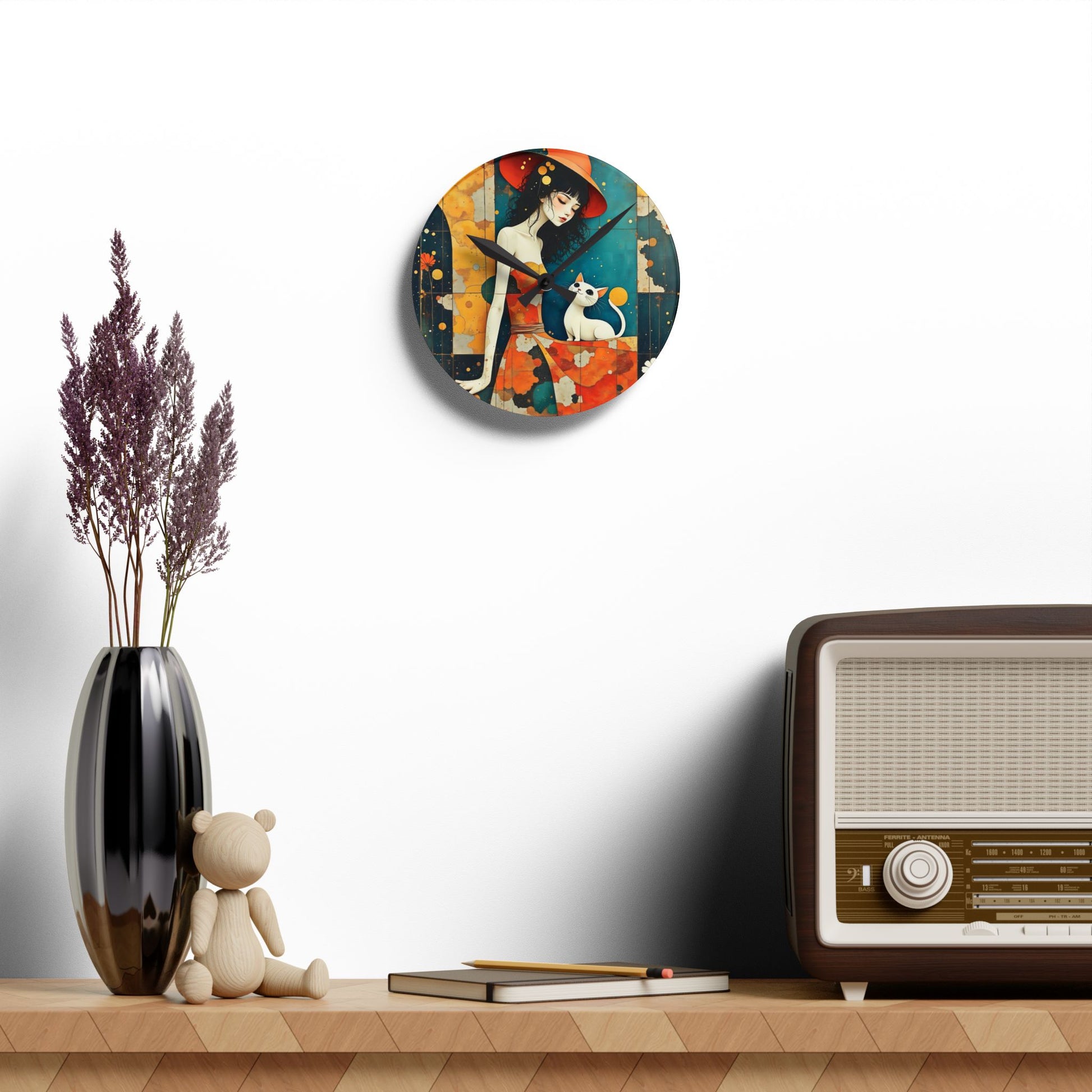 Bring the serene and magical feeling of winter into your home with this Acrylic Wall Clock featuring Witch with white cat Acrylic Wall Clock art by Fairyhill.Studio Perfect for whimsical art lovers owl lovers and holiday enthusiasts, this wall boho clock adds a touch of whimsy and nature to any room.