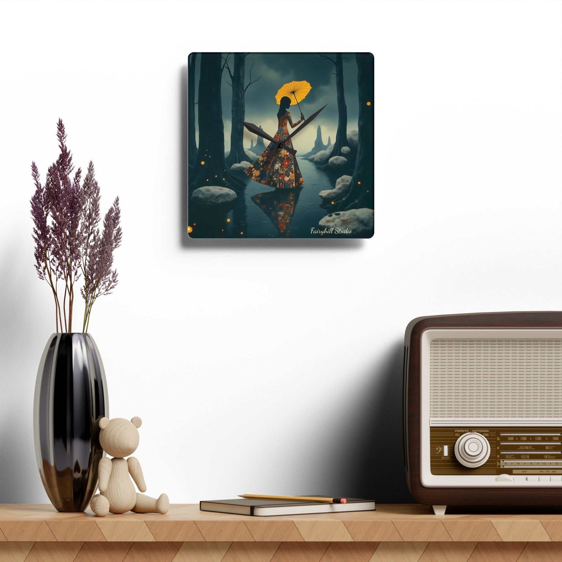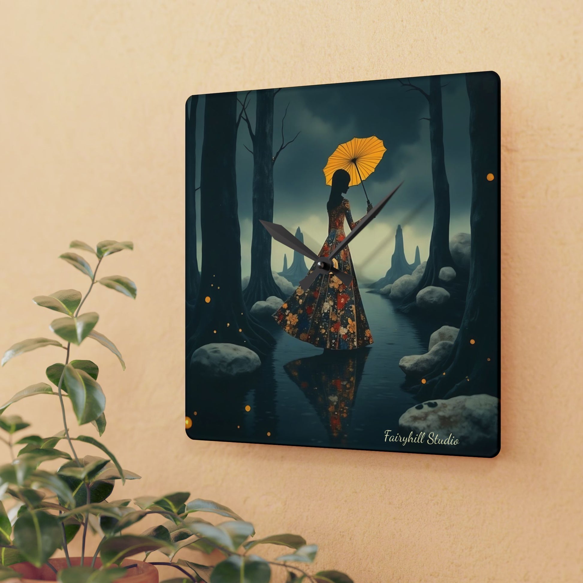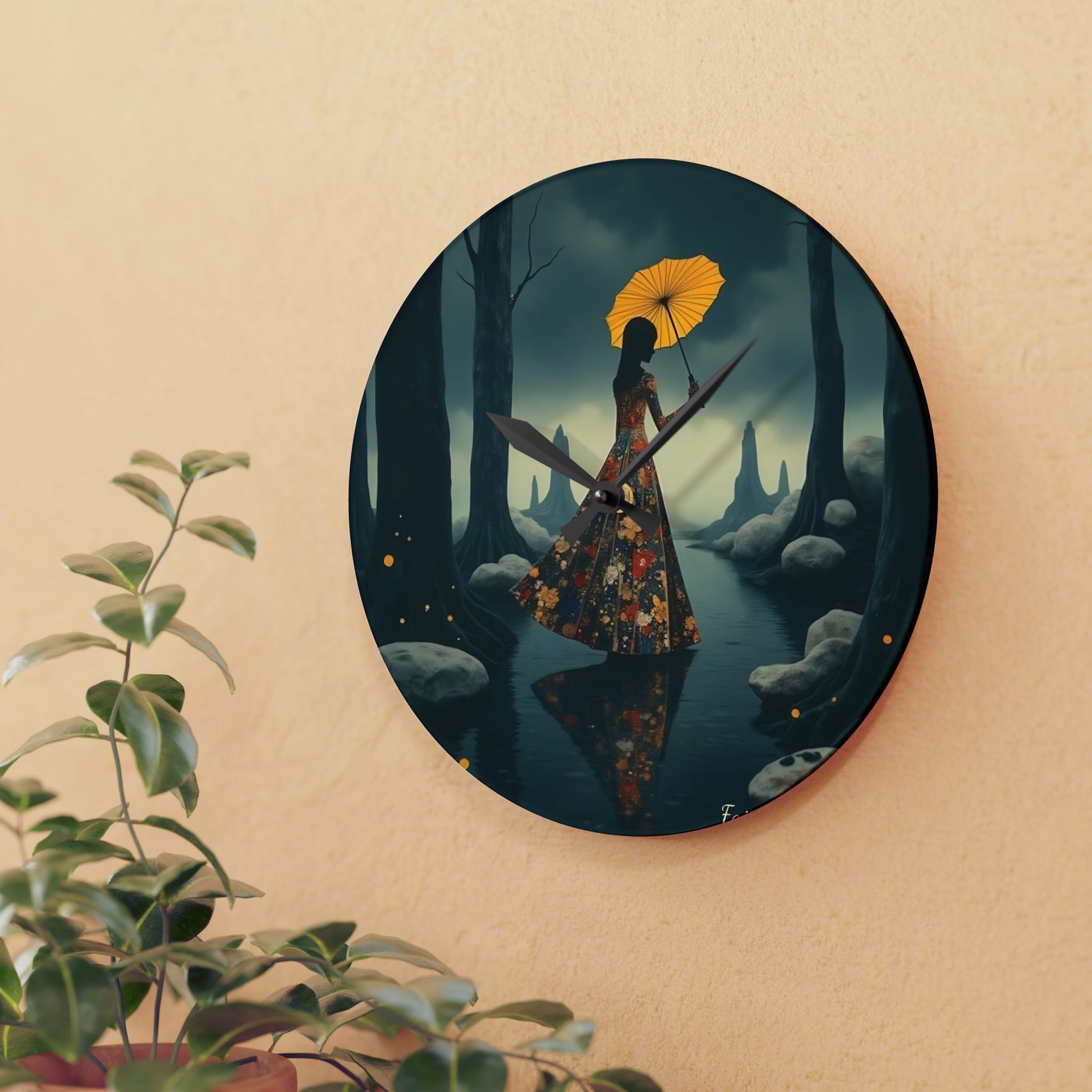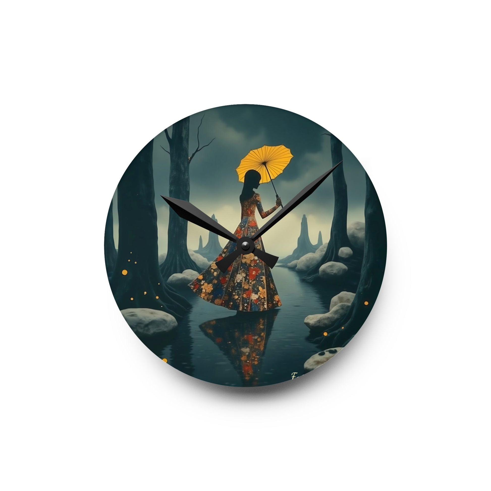 Bring the serene and magical feeling of whimsy  into your home with this Acrylic Wall Clock  Yellow umbrella  Mindfulness art Acrylic Wall Clock full moon witch  by Fairyhill.Studio Perfect for whimsical art lovers owl lovers and holiday enthusiasts, this wall boho clock adds a touch of whimsy and nature to any room.